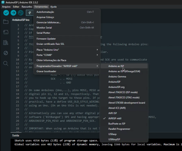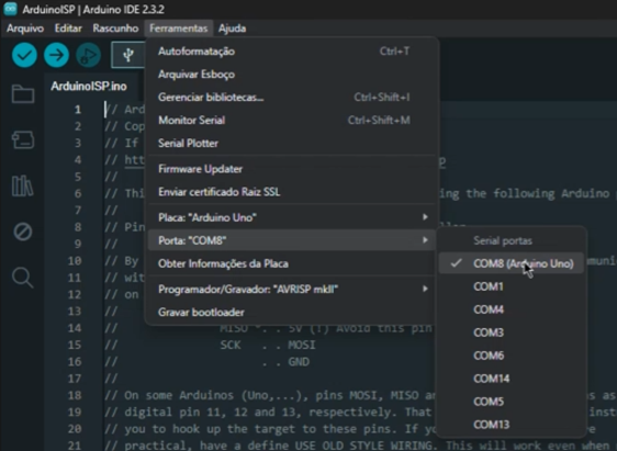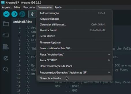 No menu Ferramentas, escolha a opção GRAVADOR e selecione Arduino as ISP.