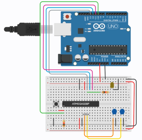 O circuito abaixo deve ser seguido para gravação do bootloader no ATMEGA328P, utilize os materiais listados acima para montar o circuito na protoboard.