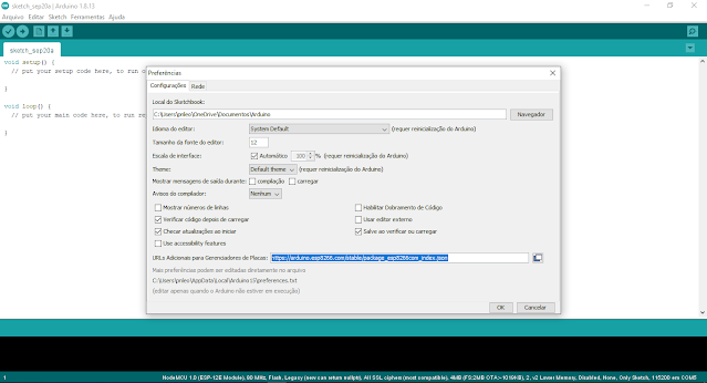 Primeiramente temos habilitar a IDE Arduino a trabalhar com o ESP8266. Para isso, é necessário abrir a IDE Arduino, ir em Arquivo e Preferências. Colocar o link abaixo no campo indicado: https://arduino.esp8266.com/stable/package_esp8266com_index.json