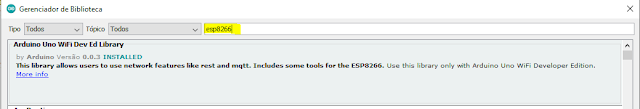 Após isso, procure as bibliotecas do ESP8266 e Blynk e clique em instalar: